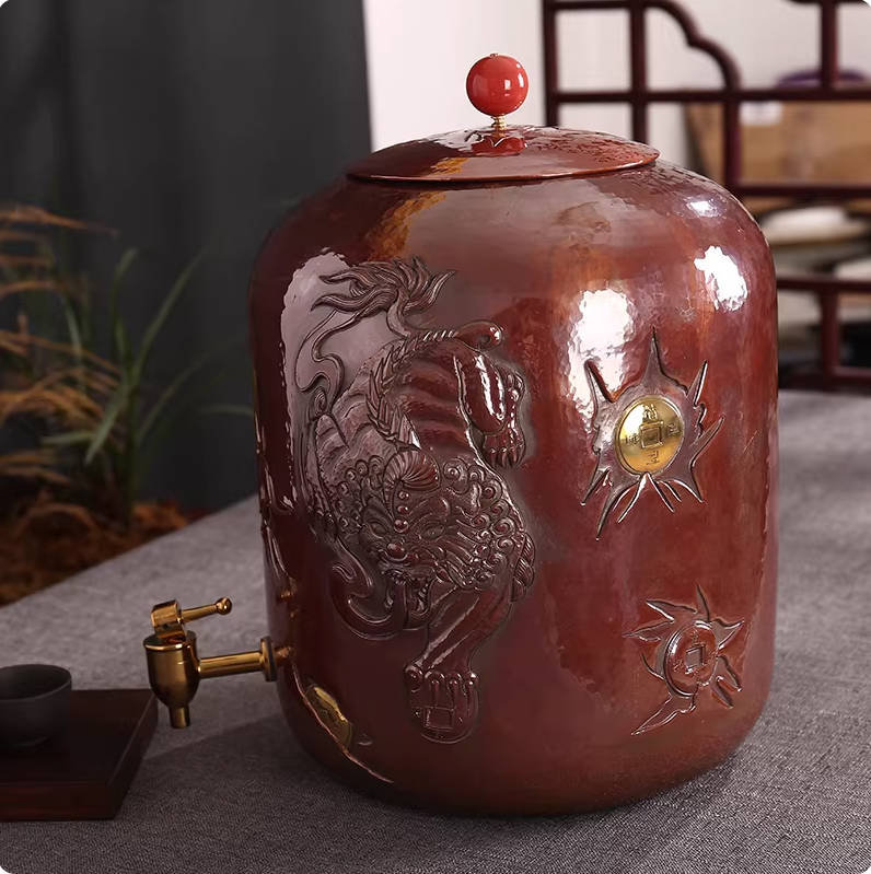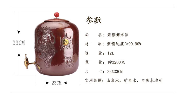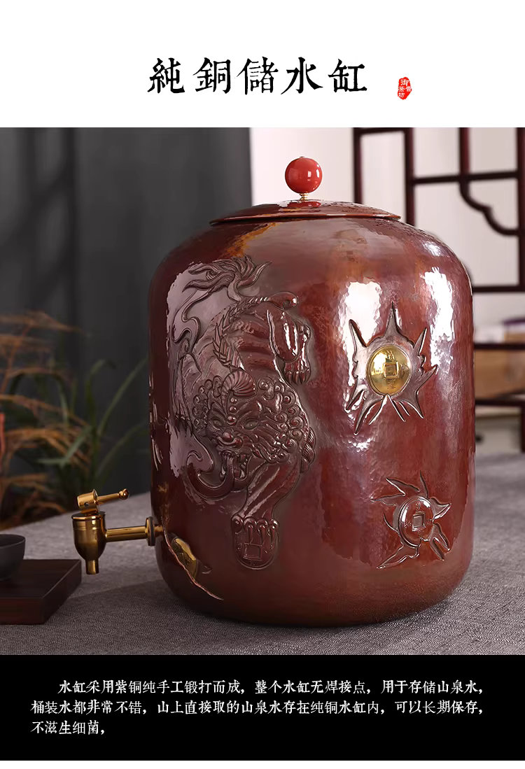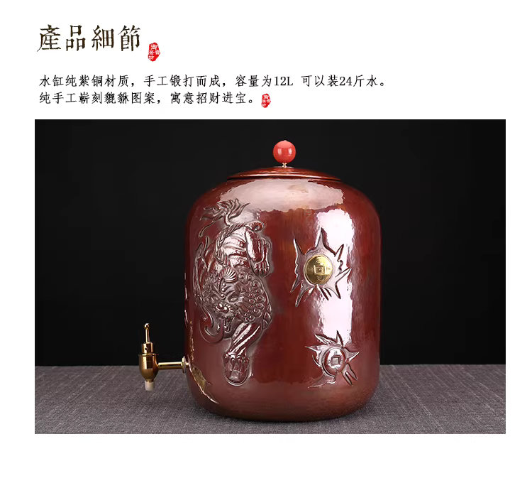 Handcrafted pure copper water tank/tea ceremony water purifier bucket with faucet and Pixiu pattern carving, large capacity 12L.