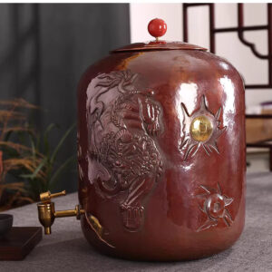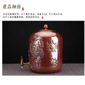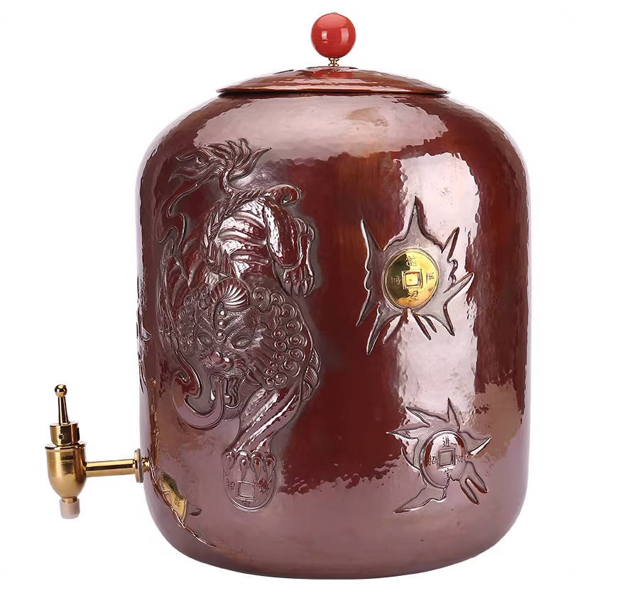 A handcrafted, pure copper water vessel/filter used in tea ceremonies, featuring a spout and carved Pixiu (mythical creature) motif, with a large capacity of 12 liters.