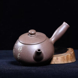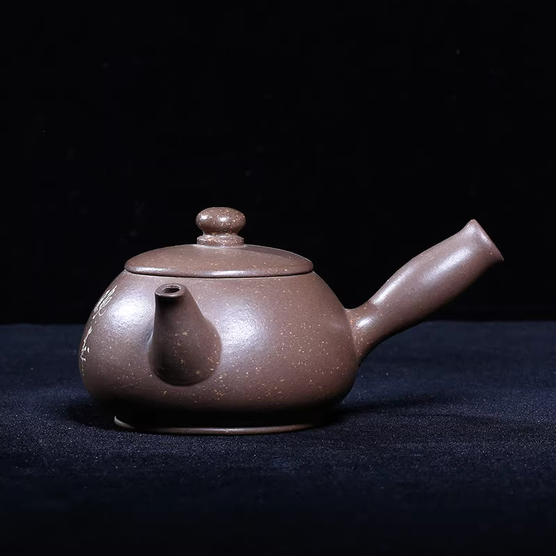 A vintage Yixing teapot from Vietnam, a top-tier auction item, made in celadon clay, 9-hole, 150cm, engraved with Tang Dynasty feather design.