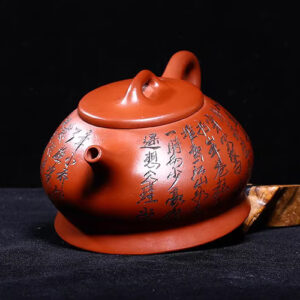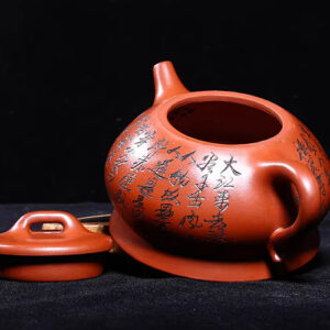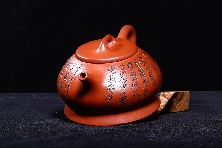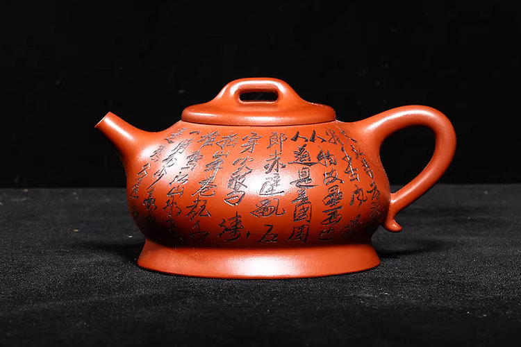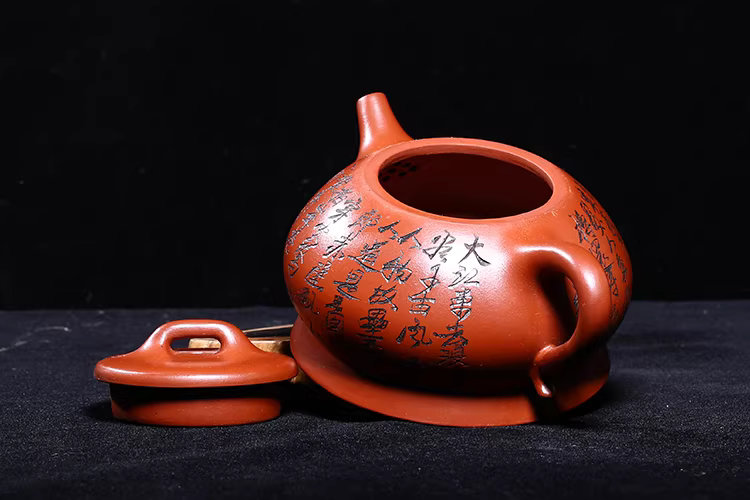 An antique Yixing teapot from Vietnam, from the first workshop of the era, crafted by Hoang Vu Lam, made of dragon blood clay, entirely hand-carved in the Han style.